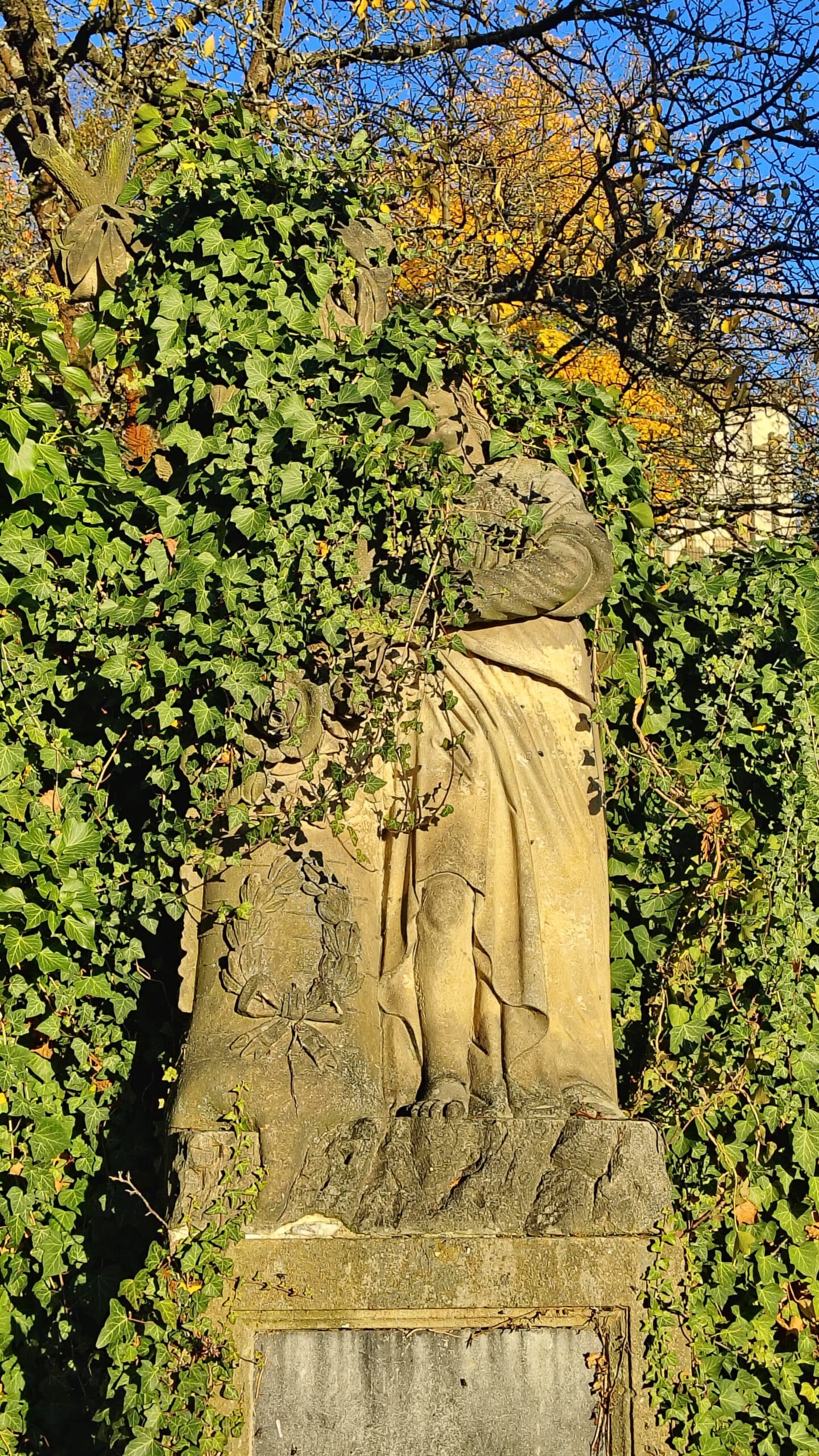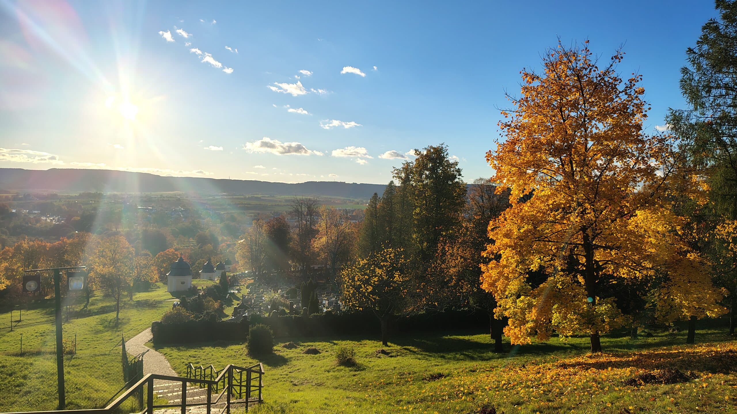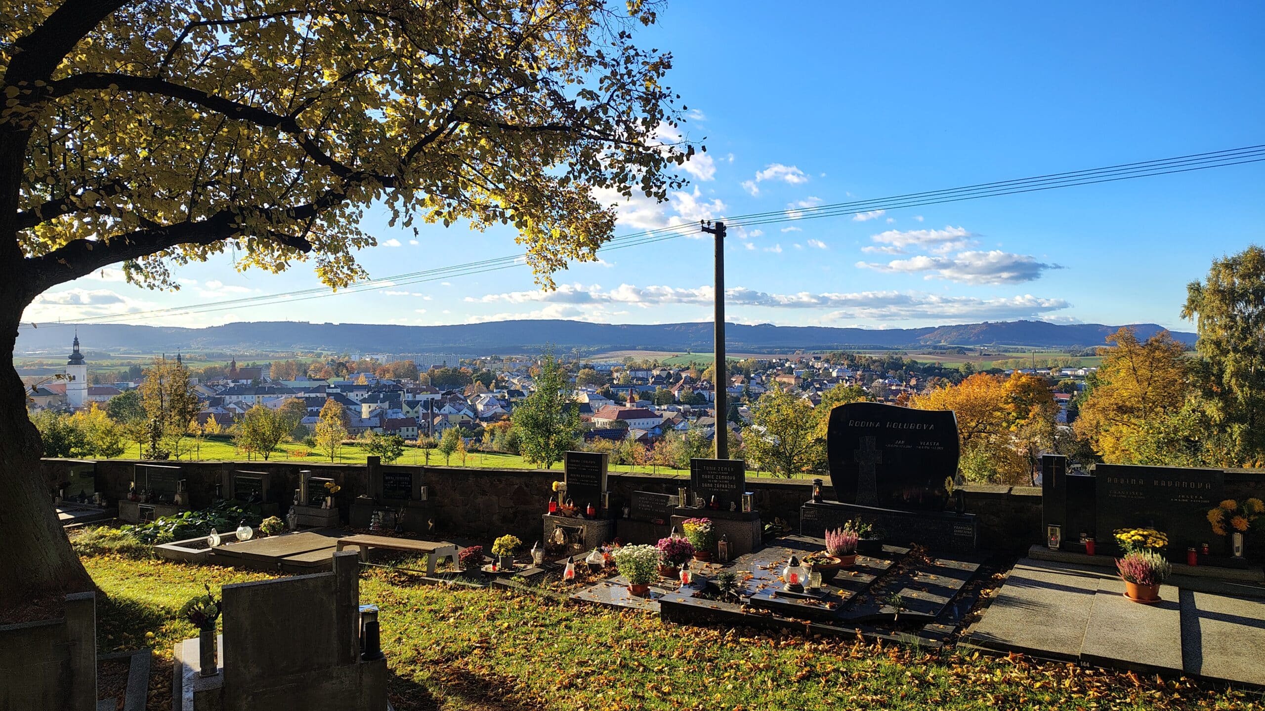 Prošel jsem se na hřbitov na kopci, který teď hraje všemi barvami a je z něj pěkný výhled na všechny strany. Kromě mě se na hřbitově pohyboval už jen jeden postarší pán s profi foťákem pověšeným na krku. Pokynuli jsme si a jali se užívat si podzimní atmosféru každý po svém. Já sem se začal po hřbitově toulat všemi směry – i těmi, kterými jsem se ještě nikdy nevydal. Je tu spousta zákoutí a členitých překážek, takže člověk má stále co objevovat. Chtěl jsem se dneska zkrátka vyhnout svému klasickému „Ahoj babi, jak se vede, tak já už zase půjdu“ momentu a strávit na hřbitově delší čas objevováním dávno zapomenutých hrobů a jejich obyvatel v tom úžasném podzimním světle.