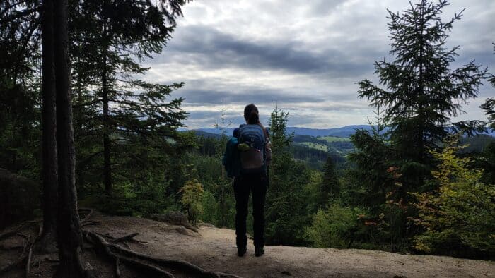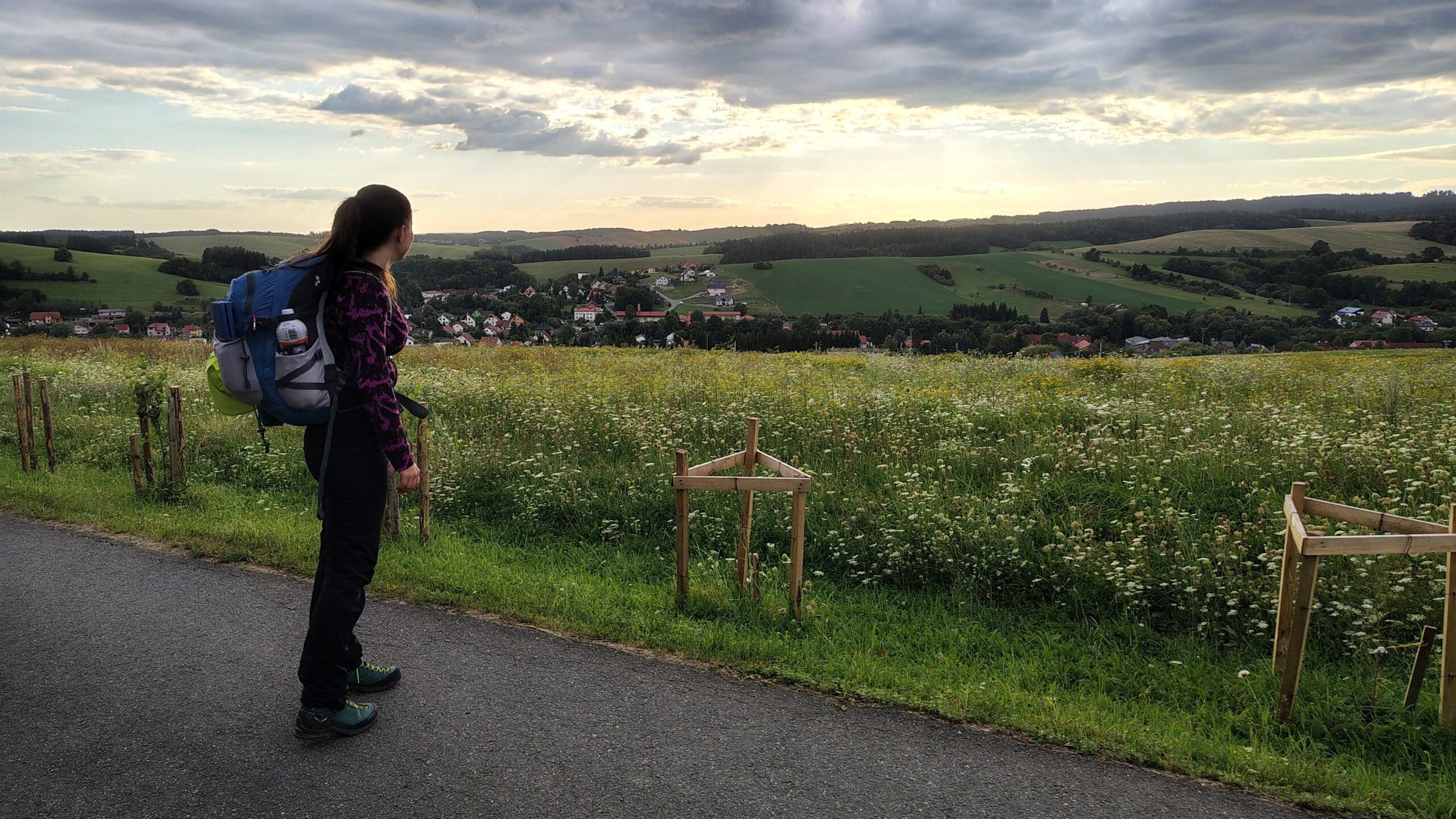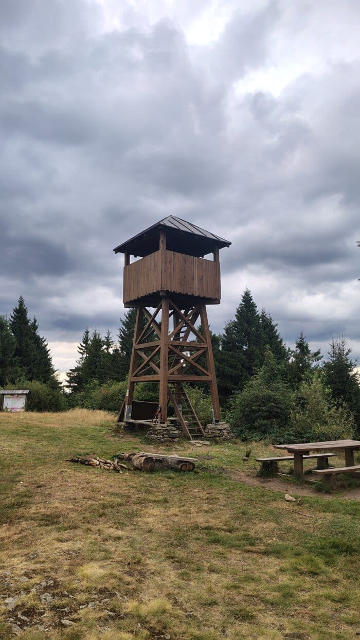 Po kyselici jsem si dal ještě kávu a když mi k němu servírka nabídla ten borůvkový knedlík, nemínil jsem osudu plivnout do tváře a objednal si ho. Chvíli jsme ještě seděli, já jsem si z powerbanky trochu dobil Garminy, využili jsme místních splachovacích záchodů a pak jsme se vydali na vyhlídku, kde se prý točil nějaký seriál s Donutilem. Neviděl jsem, ale výhledy jsou z proskleného panoramatického výjevu krásné. Chvíli jsme pokecali s postarším párem, který také sledoval panorámata, pomohli jsme jim pro vnoučata vytáhnout z automatu nějaké hračky, Leňa si orazítkovala papír a poté už jsme se museli vydat na cestu. Nohy v tu chvíli moc vyrazit nechtěly, ale měli jsme za sebou teprve třináct kilometrů. Dnešní spaní zatím nebylo rozhodnuto, jako jedna z variant byl přístřešek u vysílače za Kasárnami, tedy nějakých 29 kilometrů od startu dnešní trasy. Lehká matematika prozrazovala, že ještě nejsme ani v půlce, a protože dnešní noc by měla být opravdu chladná, nějaký přístřešek by se hodil.