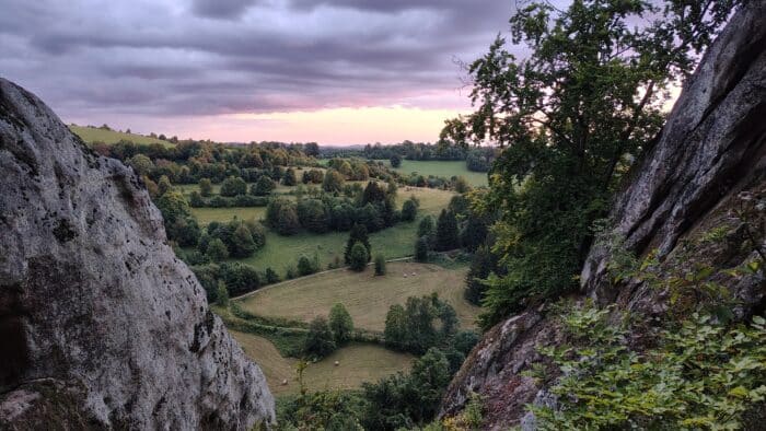 V pátek jsme měli nocování jasně dané – na desátém a dvanáctém kilometru byly přístřešky, u kterých bychom mohli přespat. Raději jsem chtěl dojít k tomu vzdálenějšímu, abychom ukrojili trochu víc kilometrů hned první den, a navíc to bylo hezčí místo na kraji lesa s výhledem do okolních kopců. Ale nejdříve nás po šesti kilometrech čekala obec Pulčín, která leží na kopci a jsou z ní pěkné výhledy. Navíc nás tu zastihla zlatá hodinka a všechno okolo jen zářilo zlatavou barvou. Několik kilometrů jsme sice museli absolvovat po asfaltu, ale jiná cesta k Pulčinským skalám z našeho směru bohužel nevede. Skály se nám zjevily hned kousek za obcí a jak jsme po chvíli zjistili, zjevit se nám neměly. Původně jsme plánovali průchod skrz skály jednosměrnou stoupací stezkou, ale v zápalu hovoru a tím, že jsme nekoukali do mapy, jsme odbočku k výstupu minuli. Skálu jsme tedy obešli a dostali jsme se na ni po turistické červené trase; celkem jsme se na vrcholku divili, kde že je jako byl ten žebřík, po kterém jsme měli lézt nahoru. Nic nám to ale neubralo na elánu; skály jsme si prolezli a pokochali se výhledy do údolí. Je to vážně moc pěkné místo a někdy bych se sem rád vrátil i s klukama, kteří by si tenhle magický plácek jako vystřižený z Pána prstenů jistě užili.
