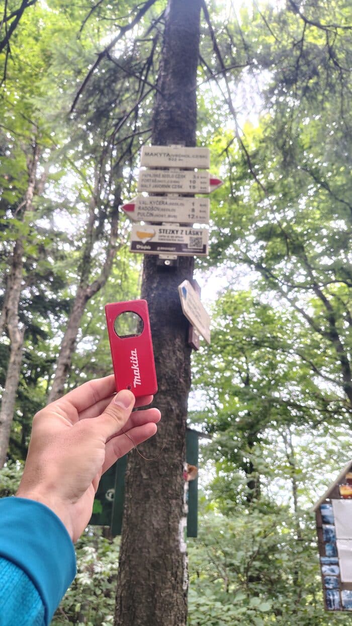 Kupředu pravou a už jsme opět šlapali po červené trase. Teplota se stále držela poměrně vysoko, takže jsem nadále šel ve svých turistických kraťasech a žádný chlad jsem na nohy necítil, ale možná to bylo i tím, že hned od prvních metrů jsme stoupali vzhůru. Jako první nás čekal výstup na Valašskou Kyčeru, abychom se přes její sedlo hned zase škrábali nahoru, tentokrát na Makytu (923 mnm). Tam nás zastihl poměrně studený vítr a protože jsme chvíli seděli, oblékl jsem i mikinu. Vítr nás ale po chvíli z vrcholku vyhnal, zapsali jsme se aspoň do deníku v místní kovové skříňce a pokračovali rychle dále. To už jsme se ocitli na česko-slovenské hranici lemované hraničními kameny, které jsme poté potkávali celý den. Těžko se budou ze země vytahovat, až zase jednou připojíme Slovensko jako svůj otrocký stát… Wait, what?