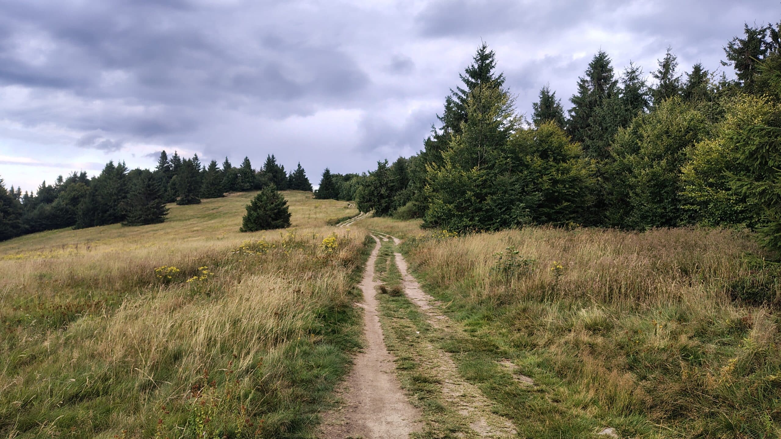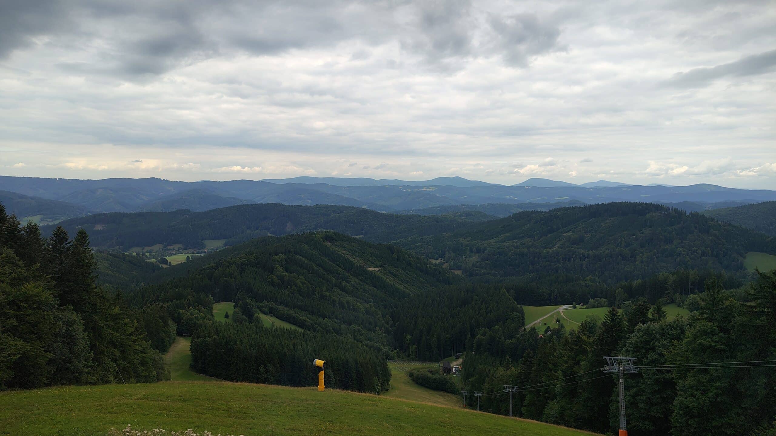 Od Krkostěny bylo stoupání už jen pozvolné a každé další vertikální metry jsme si nedovolili klasifikovat jako kopec, protože v porovnání s výstupem z Papajského sedla se jednalo tak maximálně o nakloněnou rovinu. Po kilometru jsme se dostali k pěknému výhledu a na chvíli dali odpočinout nohám. Slunce se dnes na nebi moc nevyskytovalo, oblohou plula mračna, ale zhodnotili jsme, že takhle nám to vlastně vyhovuje. Pokud zrovna nefoukalo, byla teplota ideální. Na dlouhé sezení čas nebyl, takže jsme se po chvilce zvedli a přes nevýrazný vrcholek Provazné (859 mnm) jsme se dostali pod Malý Javorník (868 mnm). V tu chvíli už to byl jen kousek k lyžařskému středisku Kohútka, kde jsme měli naplánovanou větší zastávku na oběd a odpočinek. Na Kohútku jsme dorazili někdy po jedné hodině, žádné velké davy jsme nezaznamenali. Objednali jsme si v restauraci dvě kyselice, i když borůvkové knedlíky hodně lákaly. Seděli jsme venku a počasí se honilo jak vítr v bedně; my jsme podle toho přidávali nebo ubírali vrstvy – chvíli slunce, chvíli pár kapek, déšť však nikoliv.