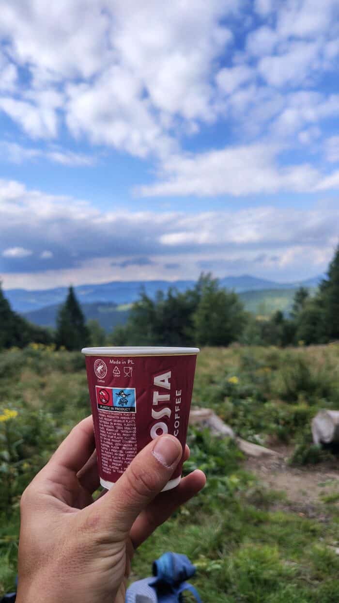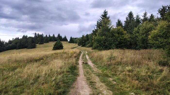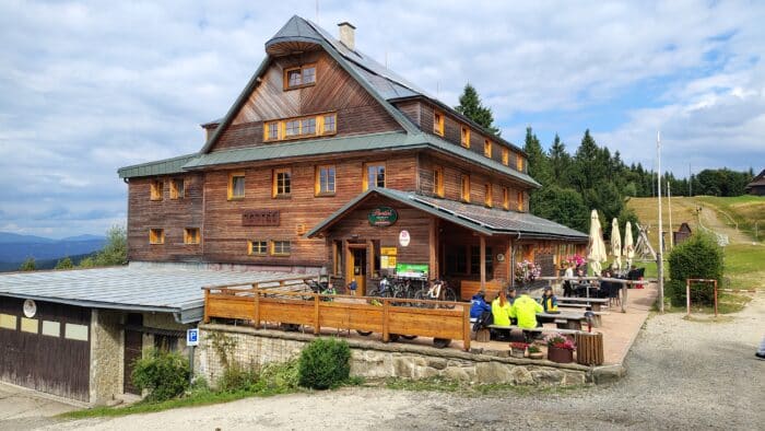 Nohám chvíli trvalo, než si uvědomily, že nejsou srolované pod stolem u oběda, ale musí taky něco dělat. Po chvíli se rozšláply a po nějakou dobu je poháněla energie z jídla. Ale ouha, nebylo by přece moudré nesednout si alespoň chvíli na Portáši… Takže po necelých dvou kilometrech už zase sedíme u stolku, Leňule si dává kávu, zatímco já zaháním žízeň birelem. Takhle by to nešlo vážení, to bychom daleko nedošli – vstyk a hybaj šlapat. Opět jsme se vydali na cestu, tentokrát už doopravdy. Nyní nás nečekaly žádné extra výhledy nebo pamětihodnosti, takže jsme po relativně krátkém čase došli na další Malý Javorník, který má tentokrát 1019 metrů. Zde se na delší čas odchylujeme od hraničních kamenů a pokračujeme dále od hranic na slovenské straně Javorníků. Ihned za Malým Javorníkem na nás vykoukne relativně nově otevřené bistro Vintrovka 2, kde si dáme kávu a výborné koláče. Ano, trochu to zatím z popisu vypadá jako typická gastroturistika, ale tohle byla v podstatě poslední občerstvovačka, která neproběhla z vlastních zásob. Když tedy vynechám kavárnu ve Velkých Karlovicích, ale to byla spíš závěrečná tečka za výletem.