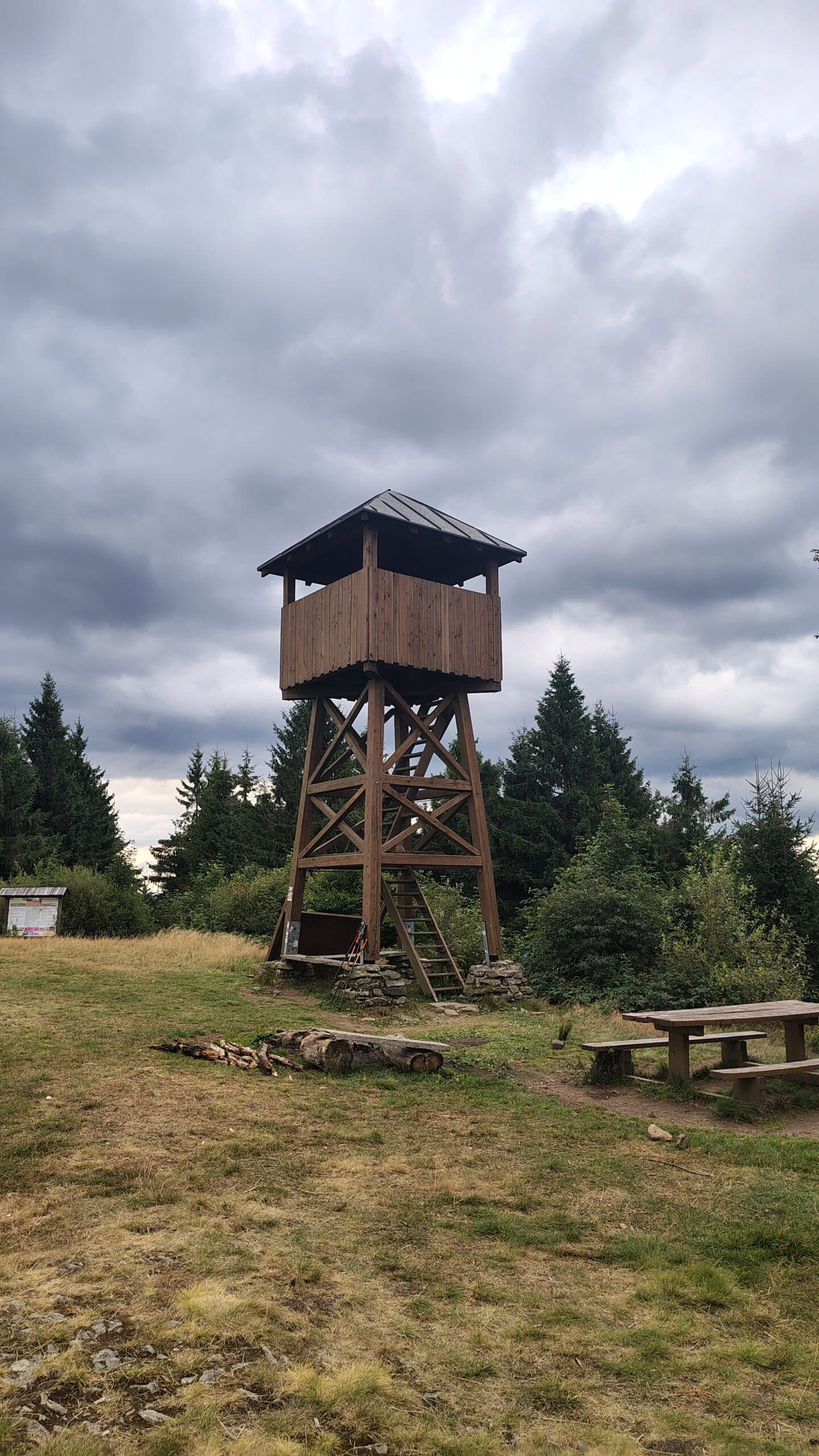 Od Vintrovky jsou hezké výhledy na opačnou stranu údolí Vsetínské Bečvy, ale kochat se moc nechceme. Máme spočítáno, že bychom mohli k přístřešku pod vysílačem dojít někdy okolo osmé. A pokud se nám nebude pozdávat, můžeme ještě další kilometr pokračovat k jinému přístřešku, který je více krytý lesem a nebude v něm tolik profukovat. To je však zatím hudba budoucnosti, nyní šlapeme k rozhledně Stratenec na stejnojmenném kopci (1055 mnm), kde by dneska chtěli přespat turisté, se kterými jsme sdíleli louku včera. Vzhledem k předpovědi a vzhledem k tomu, jak bylo nakonec v noci deštivo a větrno doufám, že si našli lepší nocleh, protože rozhledna určitě k přespání ideální nebyla, nehledě na to, že by se tam ani všichni neposkládali. Jinak je ale tato nevelká dřevěná rozhledna postavená u třech křížů celkem pěkná.