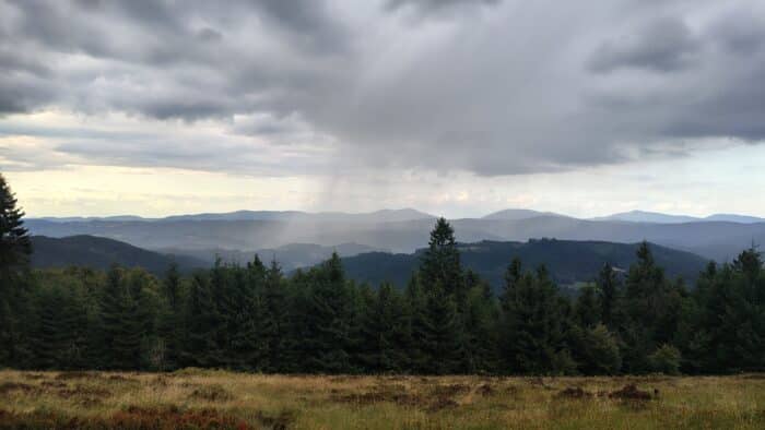 Na obzoru se zjeví lokální dešťový mrak, jehož deště zkrápějí údolí pod námi. Mrak nás několik dalších kilometrů doprovází po naší levici, než nakonec zmizí někde za obzorem, nebo se ztratí. To už pomaličku stoupáme krásnou pěšinou k nejvyššímu bodu Javorníků, a tedy i naší výpravy – Veľkému Javorníku (1072 mnm). Za pěkného počasí by tady byla skvělá přespávačka s výhledem do údolí, i ohniště tu je. Chvíli se kocháme, protože oblačnost, která se táhla po nebi celý den, se konečně začala protrhávat a slunce nesměle začíná vystrkovat paprsky, ačkoliv za chvíli už se zcela ztratí za západním obzorem. Ale zatím ne – rozhodlo se, že poslední část cesty nám prosluní a prohřeje. Ukrojili jsme z cesty další kilometr a vykouklo na nás lyžařské středisko Kasárne. Původně jsem myslel, že bychom si sem zašli na nějaké jídlo, ale protože jsme si tohle odbyli už na Kohútce, necháme myšlenku, aby se vytratila. Navíc bychom museli sejít sjezdovkou dolů, na což už se dnes necítíme. Sestoupáme tedy do blízkého sedla Butorky a víme, že dnešní nocleh už je velmi blízko. Slunce už teď jede na plno, mraky jsou fuč a nám se do posledního kopce stoupá s lehkostí. K vysílači se dostaneme po necelém kilometru. Přístřešek zde sice je, ale že by byl útulný, to o něm zrovna říct nemůžeme. Navíc je celkem otevřený a v noci má být chladno, rozhodneme se tedy, že zkusíme přístřešek v sedle pod Hričovcem. Ten vypadá z fotek velmi pěkně, není daleko a je chráněný lesem. Jsme u něj cobydup, jdeme celou cestu z kopce.