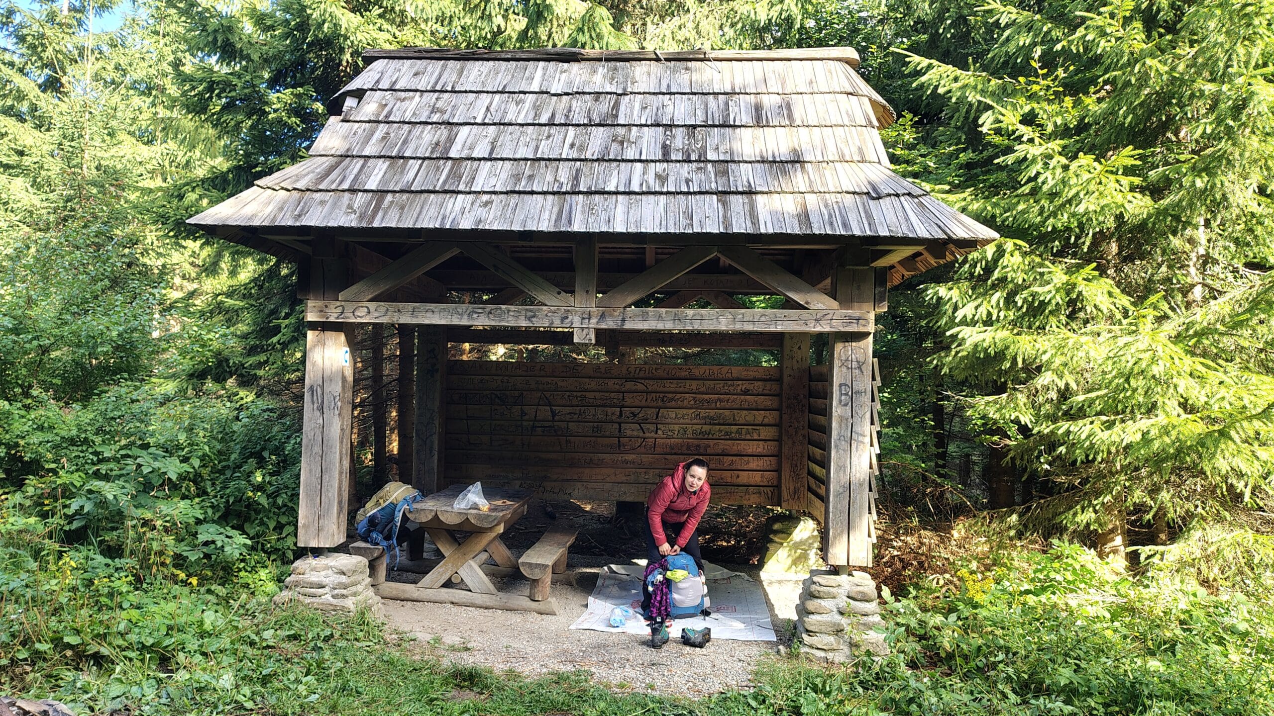 Měl jsem trochu obavu, jestli nebude obsazený jinými turisty. Ale přivítal nás zcela opuštěný. Slunce už zapadlo, ale prozatím krásně vidíme, takže obhlédneme okolí a zjistíme, že tohle místo je vlastně všechno, co jsme si mohli přát. Přístřešek je až na graffiti pěkně čistý, těžká lavice se stolem je na jedné straně, takže na druhé nám vzniklo pěkné místo na spaní. Hodinky ukazují 29.66 kilometrů a 1289 výškových metrů, tolik jsme dneska našlapali. Házím Garminy do batohu, chvíli si sedneme a přemýšlíme, co dál. Vedle přístřešku je pěkné kamenné ohniště; za chvíli se setmí, bylo by dobré najít dřevo. K mému překvapení jsou všude po lese soušky – čekal bych, že na frekventovaném místě bude veškeré hořlavé dřevo v okolí jednoho kilometru pryč, ale tady je tolik dřeva na otop, že bychom zde mohli tábořit klidně týden. Natahám pár stromů k ohništi, Léňa natrhá pár ubrousků a já poprvé v životě použiju křesadlo, abych přivolal boha ohně. Netrvalo to moc dlouho a z ohniště se začalo ozývat praskání větviček. Pořádně jsme do ohně naložili a dobře jsme udělali – za malý moment začalo pršet, což by malý ohýnek pravděpodobně nepřežil, velké plameny však kapkám odolaly. Opekli jsme si nad ohněm kousek lovečáku a pár topinek – nikdy bych netušil, že něco tak banálního může tak dobře chutnat. Protože z vlastních zásob jsme toho zatím moc neukousli, nahážeme do sebe ještě další proviant. S jídlem už nemusíme šetřit, takže do nás padají sladkosti, jablka i ovocné kapsičky. Nachystáme si spaní, ale ještě chvíli sedíme na lavičce, ačkoliv se už oba vidíme ve spacáku.